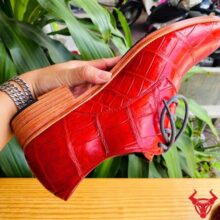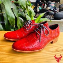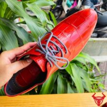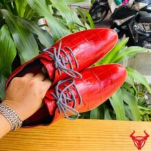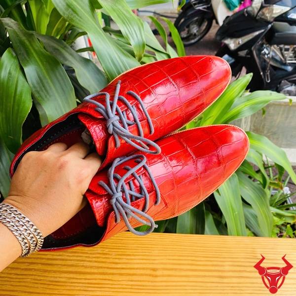 Đôi giày mang sắc đỏ nổi bật cùng chất liệu da bụng cá sấu cao cấp, được chế tác hoàn toàn thủ công, thể hiện đẳng cấp và cá tính mạnh mẽ của quý ông thời thượng.
